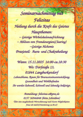 Am 15.11.2025 um14:00 Beginnt das Nachmittagsseminar "Heilen mit der Kraft des Geistes". Ihr seid herzlich willkommen!